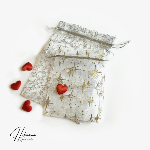 Pochon en organza - Emballage bijoux. Un joli pochon imprimé brillant en organza avec petit cordon. Pour ranger vos bijoux Hakovena, ce petit sachet en tissu fin laisse deviner ce qui se trouve à l’intérieure. Il se ferme à l’aide du cordon.